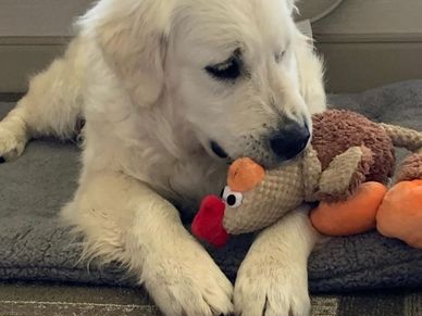 Goldens are hard chewers so you will want something sturdy. It’s OK to get soft cuddly toys but you will want to supervise to make sure they don’t swallow anything from them. My favorite chews are deer and elk antlers, which you can order from me here: https://www.redferncompanions.com/shop